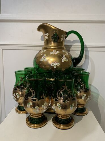 - Bohem üslubunda yaşıl şüşədən sürahi və 6 ədəd qədəh. Hər biri qızılı örtük və əl boyaması çiçək naxışları ilə bəzədilib. Sürahinin geniş tutumu, qədəhlərin isə qalın dibli, sabit ayaqlı forması var.