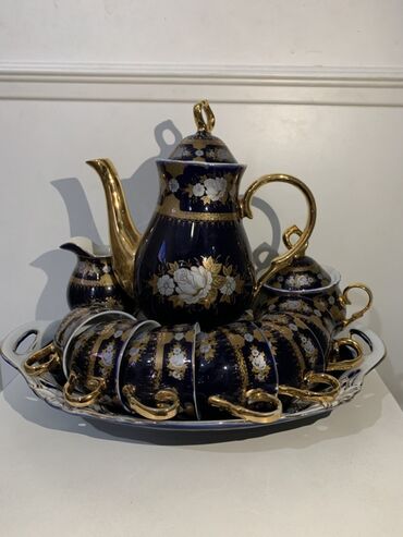 - Tünd kobalt rəngli porselen çay dəsti: qapaqlı çaydan, süd qabı, şəkər qabı, 6 fincan və 6 boşqabla birlikdə oval böyük sini. Dərin mavi fon üzərində qızılı və ağ güllü ornamentlər, qızılı qulplar və haşiyələr.