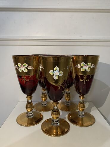 - Qırmızı şüşədən hazırlanan 6 ədəd hündür şərab/qədəh stəkanı. Qızılı ayaq və kasa hissəsində əl işi 3D çiçək dekoru, zərif oymalı motivlər.