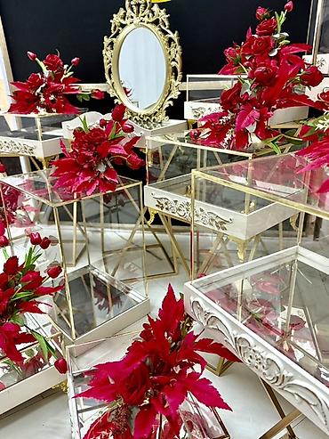 Qızılı rəngli, bəzəkli lentlərlə və muncuqlarla bəzədilmiş, şüşə qapaqlı, dörd ədəd kiçik qablardan ibarət dəst. Dekorativ görünüşü ilə xüsusi günləriniz üçün əla seçimdir.