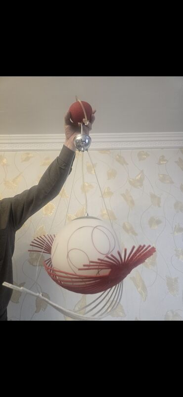 Müasir dizaynlı asma LED lustra - Tavan paneli: dairəvi, çoxnöqtəli LED işıqlarla - Asma konstruksiya: üç ədəd fərqli ölçüdə C formalı LED halqa; hər halqa daxilində dekorativ şüşə/kristal çanaq t...