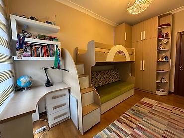 13kv.m. sahəsi olan otaq üçün sifarişlə hazırlanmış uşaq mebeli satılır. Mebelə daxildir: 1 yazı masası (ölçüsü 90x110sm) 2 mərtəbəli kravat (90x190sm), aşağı mərtəbəni divan kimi və yığılıb açılan kravat kimi istifadə etmək mümkündür (sofa bed). İkinci mərtəbəyə qalxan pilləkənləri siyirmə kimi də istifadə etmək olar. 1 ədəd künc dolabı (şkaf) - dərinlik 50sm, hündürlük 280sm. Heç bir zədəsi, cızığı yoxdur. Uşaq otağında istifadə olunmasına baxmayaraq çox səliqəli istifadə olunub. İstifadə olunan material: EGGER H3006 ST22 laminat. Real alıcılar yazsın ünvan Milli Aviasiya akademiyasının arxasi Aviator şəhərciyi kod 3883(Lx)