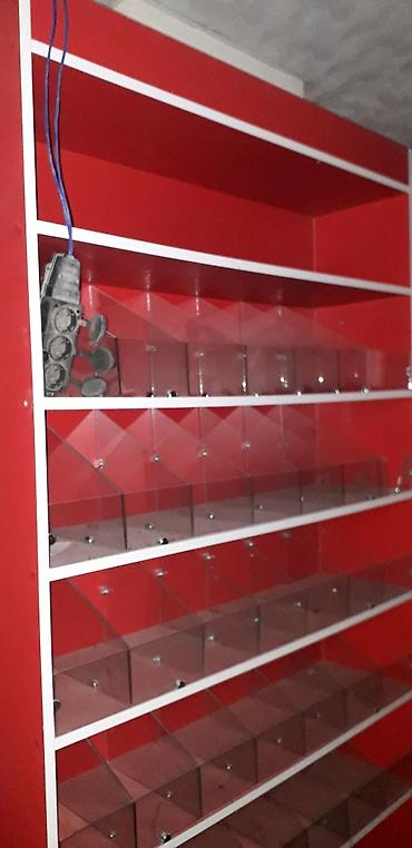 - Qırmızı-ağ dizaynda divar əlvan vitrin rəfləri: bir neçə səviyyəli, şəffaf akril bölmələr ilə (xırdavat, şirniyyat, qəlyanaltı, kosmetik və s. üçün ayrı-ayrı gözlər).