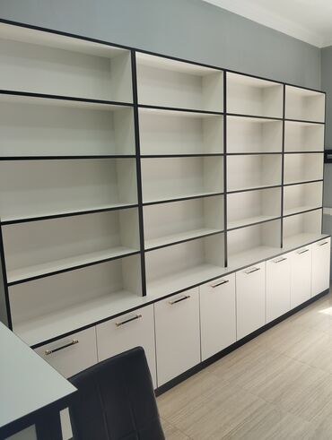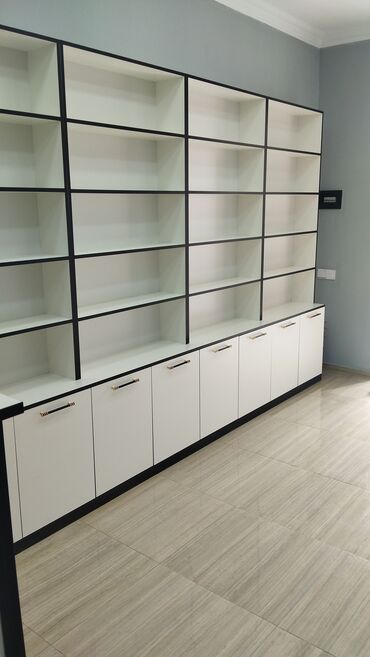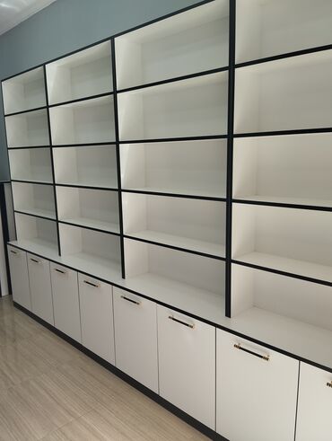 - Divar vitrin sistemi: Tavandan‑döşəməyə qədər, modul konstruksiya. 3 bölməlik böyük açıq rəflər (çoxsaylı gözlər) və aşağı hissədə qapalı dolablar. Qolları metal, qara konturlu ağ panellər.