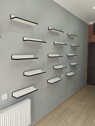 - Asma dekorativ rəflər: Eyni üslubda, bir divar boyu çoxsaylı kiçik platformalar; aksesuar, kosmetika, ayaqqabı, suvenir və s. sərgisi üçün uyğundur.