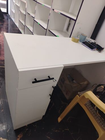 - Kassir/iş masası: ağ stolüstü, sağ tərəfdə saxlama bloku. Üstdə bir çekmece, altda qapılı bölmə; qara metal tutacaqlar. Kompakt ölçülü, mağaza və ya ofis üçün praktikdir.