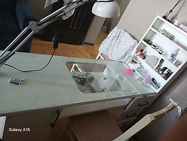 - Şüşə üstlü funksional manikür masası: mərkəzdə tozudar üçün kəsik bölmə, geniş iş səthi, alt hissədə rəf və çekmecələr.