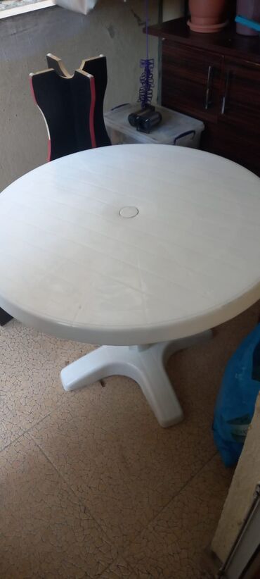 Açıq hava üçün dairəvi plastik masa - Material: möhkəm, hava şəraitinə davamlı plastik - Rəng: ağ - Forma: dairəvi - Ölçü: təxmini 4 nəfərə uyğun geniş səth - Mərkəzdə çətir dəliyi (örtülü qapaqla...