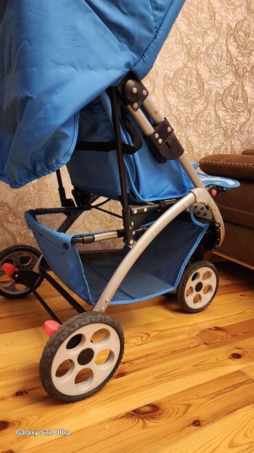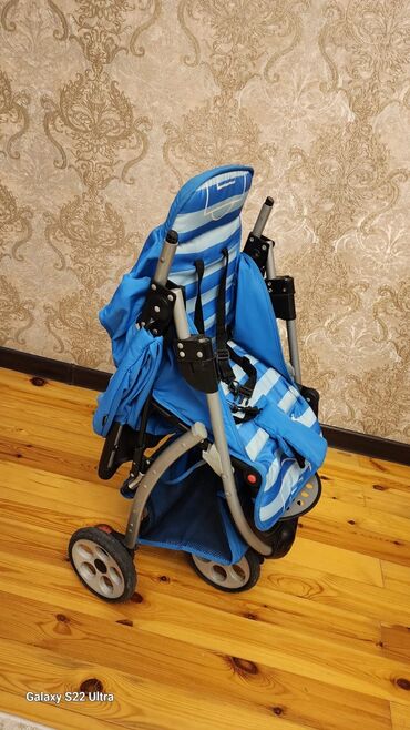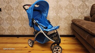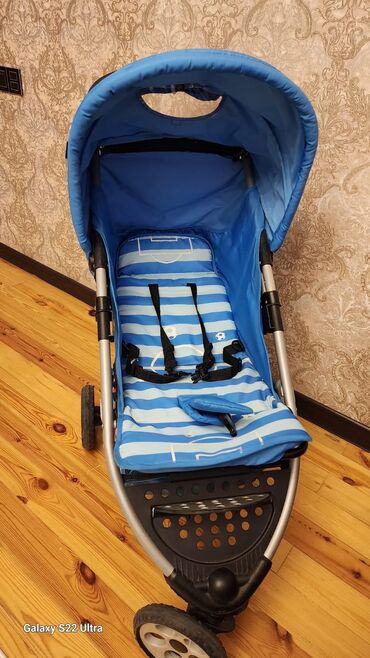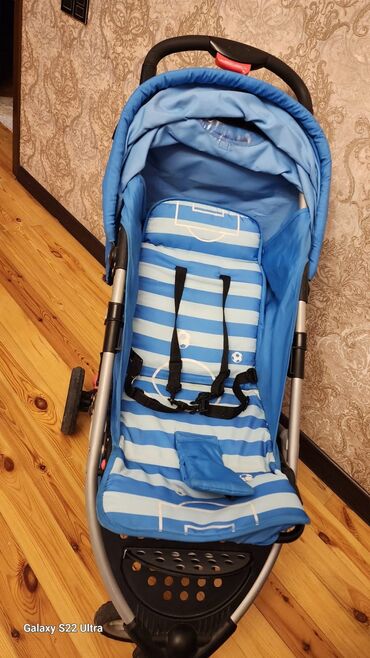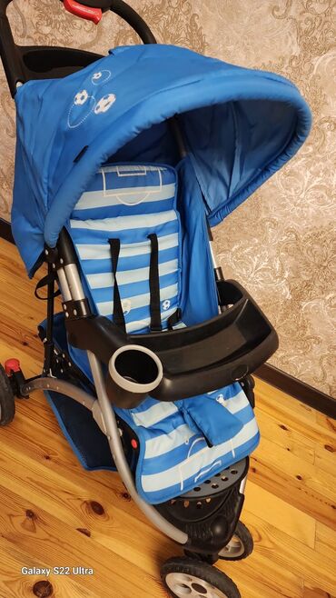 Uşaq arabası – mavi rəng, futbol temalı oturacaq və örtük dizaynı