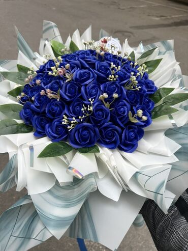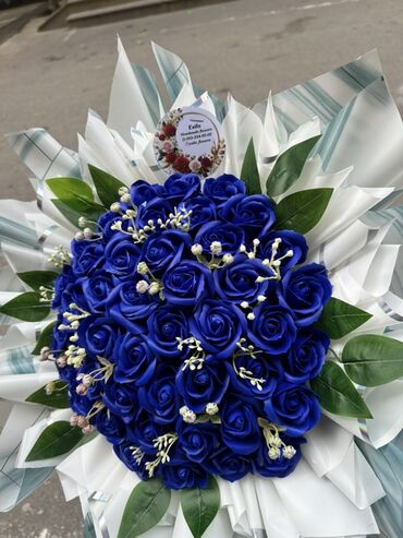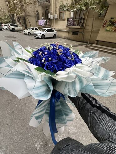 Qeyd: Buket tam şəkildə fotolardakı kimi dizayn edilib; rəng palitrası əsasən kral mavisi, ağ və açıq yaşıl tonlarıdır.