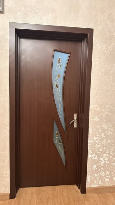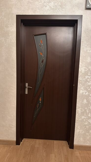 Daxili qapı – qəhvəyi (ağac teksturalı) MDF/Laminat səthli, dekorativ şüşə panellərlə.