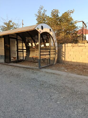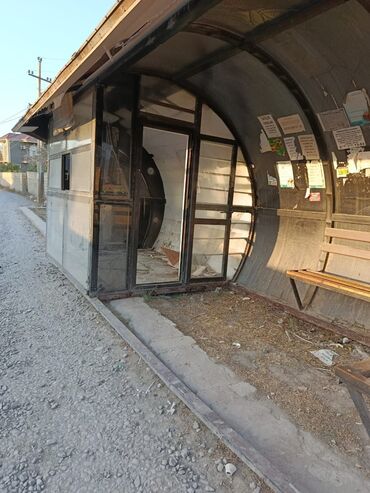Metal konstruksiyalı küçə köşkü / ticarət pavilyonu - Ölçülər: təxmini 3×4 m (şəkillərə əsasən), beton bünövrə və pilləkən. - Karkas: metal, üzlüyü və damı profil/şifer tipli material. - Ön və yan...