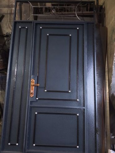 Qara rəngdə, müasir dizaynlı metal qapı. Üzərində üfüqi xətlər və gözləmə yeri var. Ev və ya ofis üçün təhlükəsiz və estetik seçimdir.