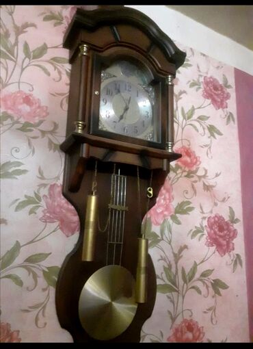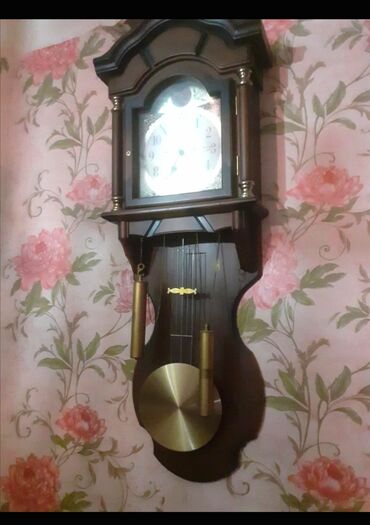 Divar saati – mexaniki, pendulumlu - Korpus: cilalanmış təbii ağac, klassik retro dizayn, yuxarı hissədə dekorativ relyef element. - Siferblat: səkkizguşəli çərçivəli, ağ əsas, qara ərəb rəqəmləri...