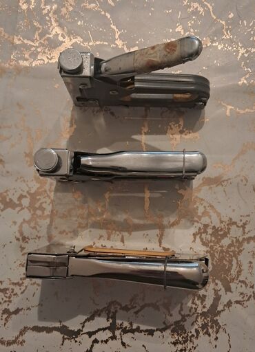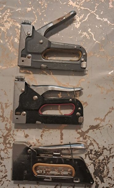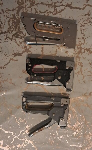 - Üç ədəd əl ilə işləyən skob tapançası dəsti. Korpusları metal gövdəlidir, yay mexanizmi ilə işləyir.