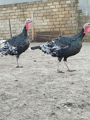 tecılı satılır Təsvir: - Açıq həyətyanı şəraitdə bəslənmiş hinduşkalar. - Rəngləri: əsasən ağ fon üzərində qara/boz zolaqlı naxışlar; erkək fərddə iri, yelpikvari quyruq, qırmızı işvə və mavi baş...