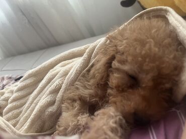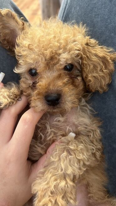 Toy Poodle balası 7 aylıq erkekdir - Cins: Toy Poodle (orta ölçü) - Rəng: Açıq krem/qızılı - Xüsusiyyətlər: Hipoallergen tüklü, az tük tökür, qıvrım yumşaq kürk, qısa pəncələr və kompakt bədən qur...