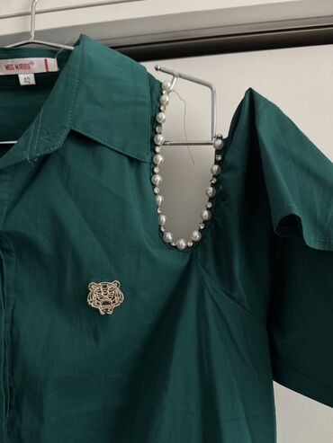 Yazlıq/şıq qadın köynəyi L razmer - Rəng: tünd yaşıl fon üzərində krem-ağ abstrakt naxış - Model: oversize/relaks kəsim, önü düyməlidir - Yaxa: klassik köynək yaxası - Qol: yarasa (batwing) tipli g...