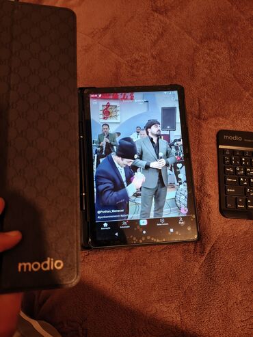 - Planşet: Modio brendi. Böyük ekranlı (şaquli və üfüqi istifadəyə uyğun), video izləmə və sosial şəbəkələr üçün münasib. Ekranda qatlanan-qapaqlı korpus ilə istifadə olunur; sol tərəfində Modio loqolu qoruyucu üzlük/kover göstərilir.