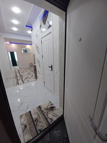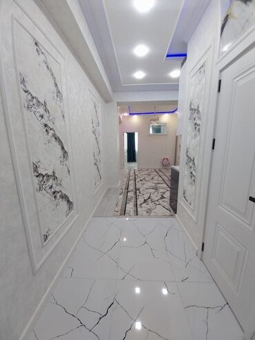 - Giriş və dəhliz: Parlaq mərmər naxışlı keramika döşəmə, dekor panellər, çoxsaylı spot işıqlar.