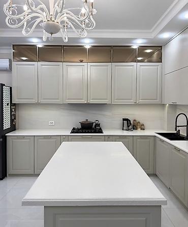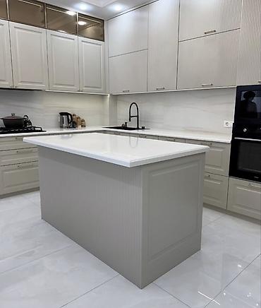 - Ümumi plan: L formalı iş zonası + mərkəzi ada, geniş iş səthi və rahat hərəkət trayektoriyası