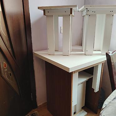 Ağ rəngdə, MDF/LDSP materialdan hazırlanmış kiçik masa və taburet dəsti.