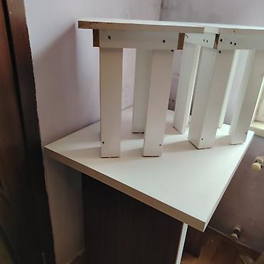 - 1 ədəd kompak təkərsiz masa: kvadrat/künc formalı üst səth, ağ laminat örtük, tünd ağac rəngli karkas.