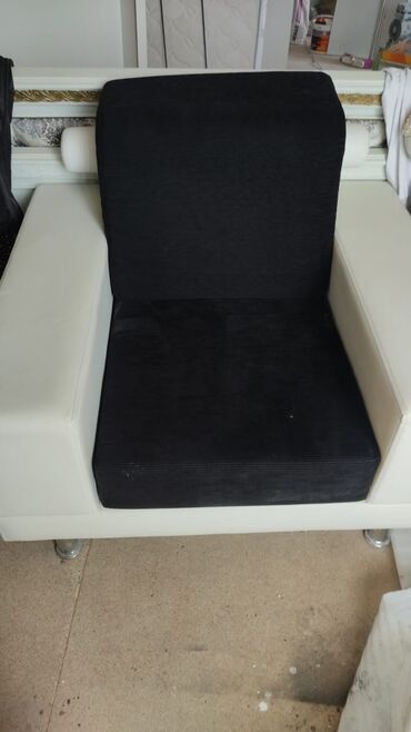 - Komplekt: 1 iki yerlik modul + 1 tək yerlik kreslo. İki yerlik modulda ortada silindrik bel dayağı, üzərində iki ədəd qara-ağ kvadrat naxışlı dekorativ yastıq.