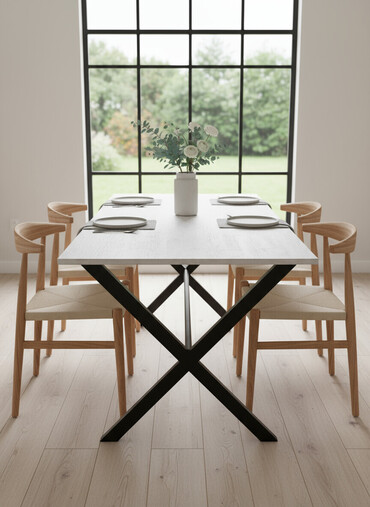 Masa – müasir minimal dizayn - Üst səth: ağ-açıq ağac teksturalı laminat/kompozit lövhə, düzbucaqlı forma - Ayaqlar: qara metal konstruksiya, X formalı dayaq sistemi ilə möhkəm və stabil - Rəng kom...Giriş•Qeydiyyat