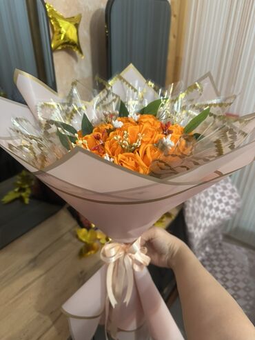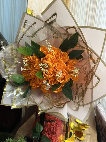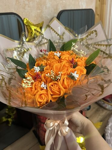 Buket – dekorativ güllər kompozisiyası - Rəng palitrası: canlı narıncı qızılgüllər, ağ kiçik çiçəklər və boz tonlarda dekor elementləri - Kağız bəzək: bir neçə qat mavi və tünd-mavi florist kağızı...