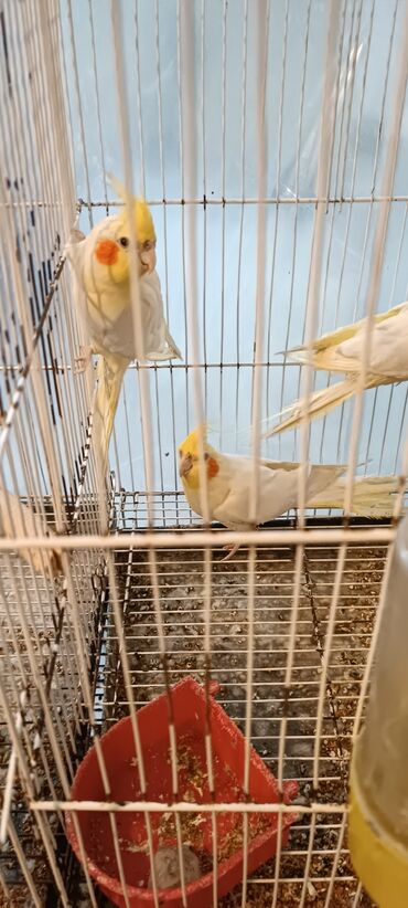 Nimfa tutuquşuları cütü və qəfəs dəsti - Növ: Nimfa (Cockatiel) – bir sarı/albino tonlarda, biri boz-çəhrayı naxışlı. Hər ikisinin yanaqlarında portağal rəngli “yanaq ləkəsi” var. - Qəfəs: Ağ meta...