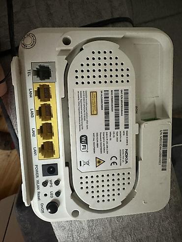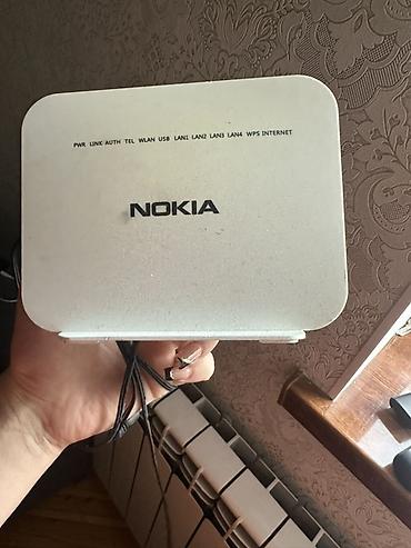 Nokia Wi‑Fi router - Model: Nokia (üzərində “Nokia” loqolu, iki xarici antenalı) - Qoşulmalar: WAN/ONT üçün giriş, birdən çox LAN portu (LAN1–LAN5 işıq indikatorları qeyd olunub), TEL/VoIP üçün po...40 AZN