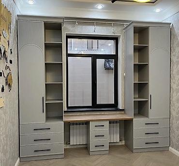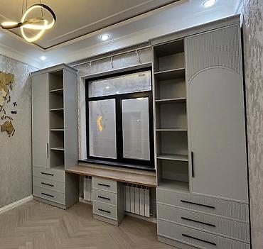 - Pəncərəni əhatə edən iş/oxu küncü: ortada ağac fakturalı masaüstü, altında 3 çekmecəli dolab bloku, hər iki tərəfdə əlavə 3 çekmecə.