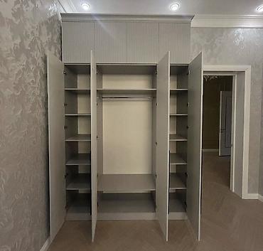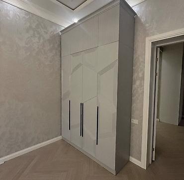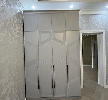 - Ayrı geyim şkafı: çoxbölməli, asılqan və rəf zonaları, tamhündür qapılar, üzərində dekorativ həndəsi frezlər, qara uzun tutacaqlar.