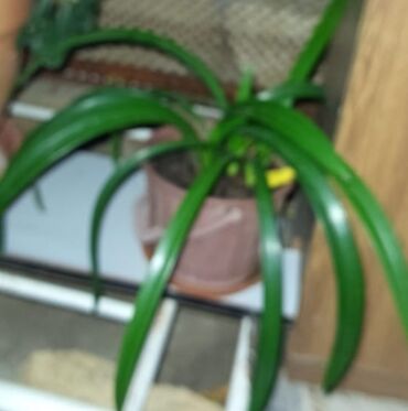 - Sansevieria/Clivia tipli geniş, parlaq tünd-yaşıl yarpaqlı bitki – plastik dibçəkdə. İşıqlı, lakin birbaşa günəşsiz yerləri sevir, seyrək suvarma ilə kifayətlənir. Yarpaqlar dik və lentvari formadadır, interyerə müasir görünüş qatır.