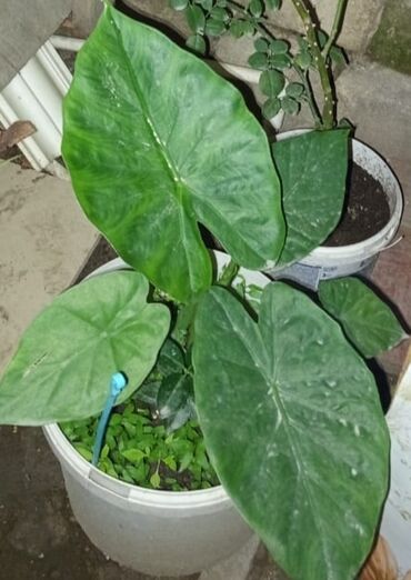 - Alokaziya/kolokaziya (fil qulağı) – iri, ürəkvari yarpaqlar, aydın damar strukturu. Ağ vedrə tipli qabda. Yarı kölgədə yaxşı inkişaf edir, rütubəti sevir. Tropik akcent üçün ideal, geniş yarpaqları ilə yaşıl fon yaradır.