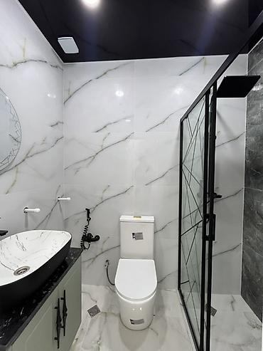 - Mətbəx/niş: Divarlarda mərmər effektli panellər, işıqlandırma ilə; mərtəbə keçidində suya davamlı səthli zona ayrılıb.