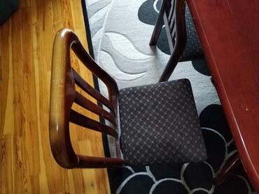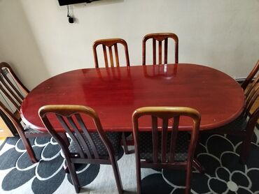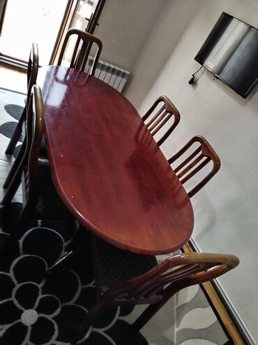 - Yemək otağı dəsti: klassik üslublu masa və 6 ədəd stul - Masa: tünd qırmızı (maun rənginə yaxın) parlaq laklı üst səth, dördkünc forma, yığcam ölçü; dörd möhkəm taxta ayaq - Stullar: taxta karkas...