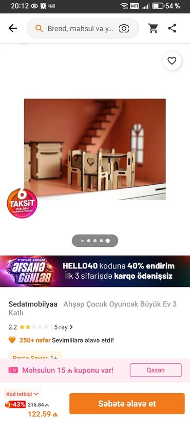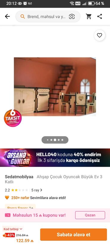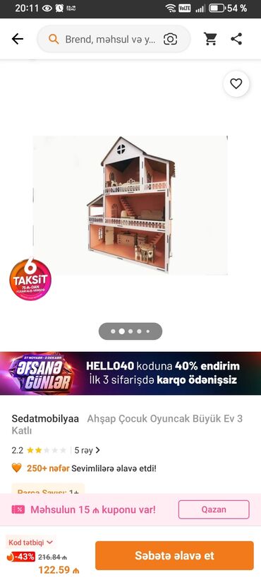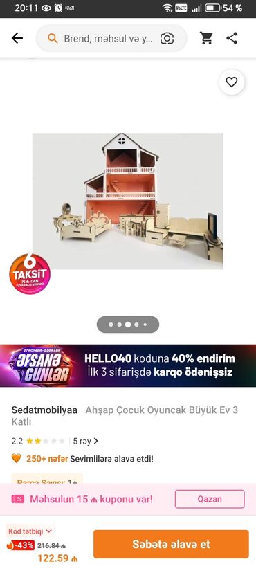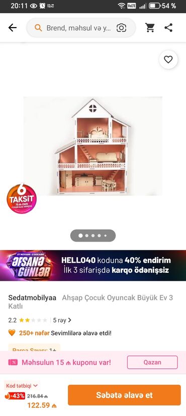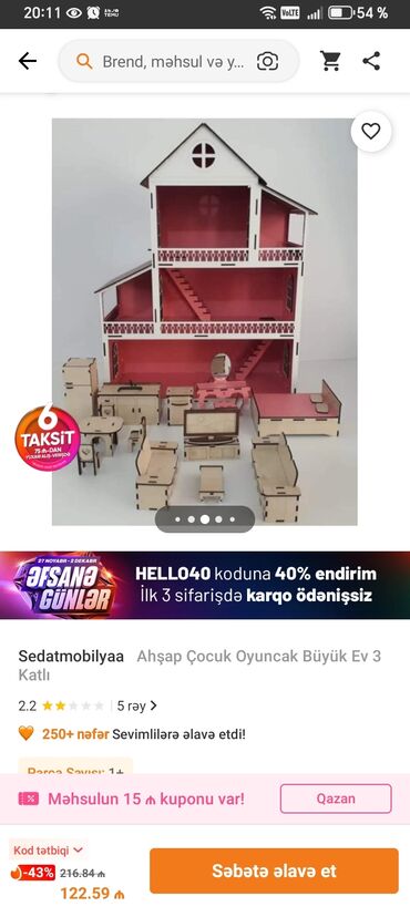 Son qiymətdi.150manata alınıb demek olar islenməyib yaxsi vəzyətdədir.Taxta oyuncaq kukla evi - Material: təbii ağac və MDF kombinasiyası, hamar cilalı səthlər - 2 mərtəbəli açıq planlı interyer -...