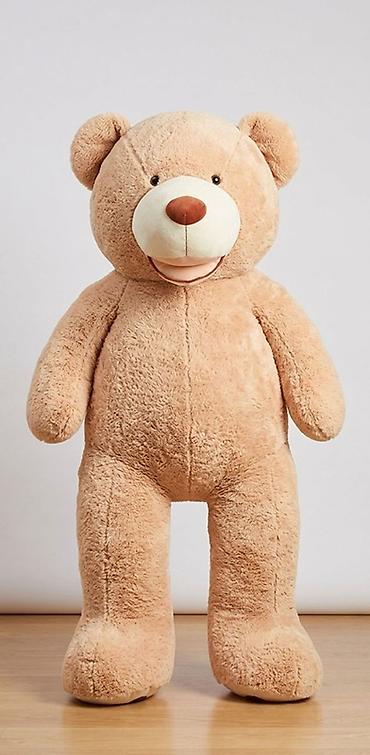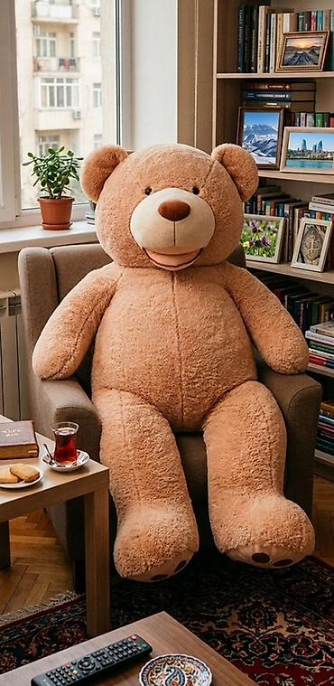 Böyük plyuş ayı oyuncağı - Rəng: açıq bej - Material: yumşaq, tüklü plyuş parça; içlik – həcmi yaxşı saxlayan sintepon/dolgu - Boy: təxminən insan boyuna yaxın (divanda oturmuş vəziyyətdə iri ölçü...