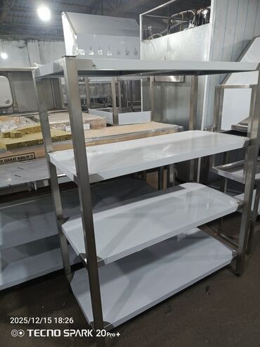 Paslanmayan poladdan peşəkar mətbəx avadanlıqları - 4 mərtəbəli paslanmayan polad rəf: ağır yüklər üçün möhkəm konstruksiya, qaynaq birləşmələri, tənzimlənən dayaq ayaqları. İstehsalat və ictimai ...