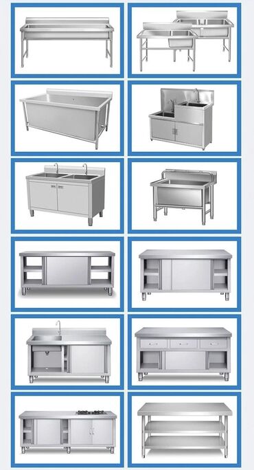 Şəkillərdə müxtəlif ölçü və konfiqurasiyalar göstərilib: tək/iki göz, vanna tipli, çekmecəli və sürgülü qapılı dolablı lavabolar, açıq rəfli iş masaları və kombinə edilmiş stansiyalar.