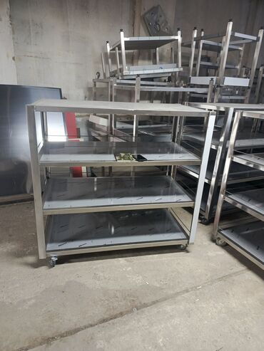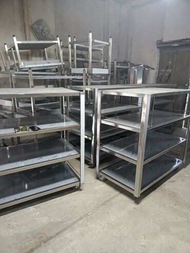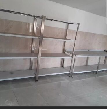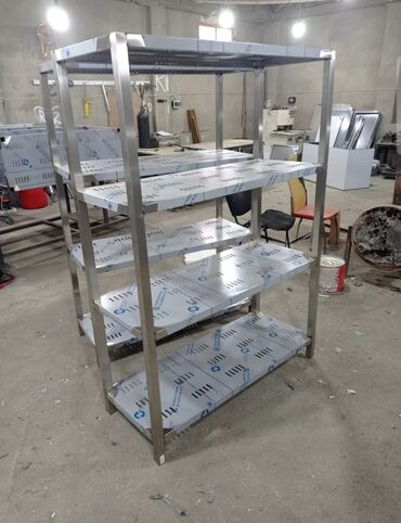 Paslanmaz poladdan istehsal olunmuş sənaye rəfləri - Material: 304 tipli paslanmaz polad karkas və polad rəf səthləri - Konstruktor: möhkəm kvadrat profil çərçivə, qaynaq birləşmələri - Rəf sayı: ...