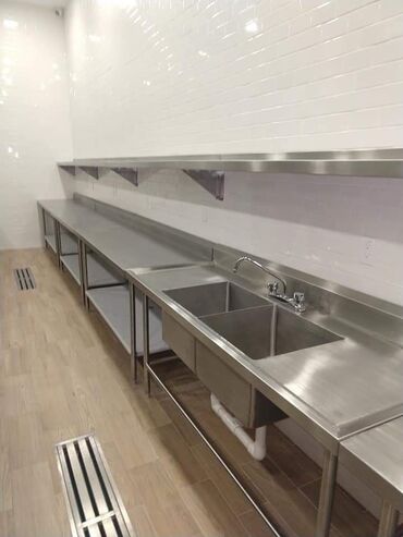 Ölçülər şəkillərdə görünən modul kombinasiyalara uyğundur: uzun xətt masalar, dərin ikikameralı lavabo, divar tipli çoxmərtəbəli rəflər və alt rəfli stasionar stollar. Gigiyena və ergonomika üçün kənarları radiuslu, qaynaq və bərkidilmələr sənaye standartlarına uyğundur.