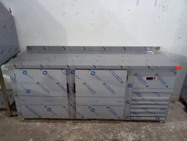 - Paslanmayan polad mətbəx masası‑dolab – geniş iş səthi, sağda çoxgözlü siyirtmələr, solda sürüşən/qanadlı qapılarla saxlama bölmələri. Arxa tərəfdə sıçramaqdan qoruyan bort.