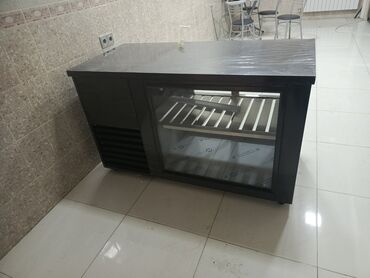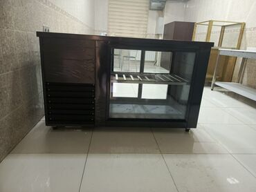 - Alt hissəsi şüşə vitrinli tezgah: üstü paslanmayan polad iş səthi, ön tərəfi sürgülü/şüşə qapılı vitrin; içəridə paslanmayan polad rəflər; solda kompressor bölməsi; tənzimlənən ayaqlar