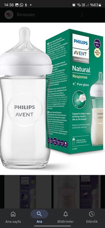 Ayka….Philips AVENT Natural Response şüşə biberon – 240 ml - Material: saf cam (Glass Baby Bottle) - Uç: Natural Response – ana südü ilə qidalanma ritmini təqlid edir, əmzirmə ilə biberon qidalanm...