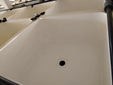 Texniki ölçülər şəkillərə əsasən iri həcmli (dərin kasalı) modeldir; drenaj çıxışı standart PVC ölçülərinə uyğundur. Aquakultura təsərrüfatı, karantin və yetişdirmə stansiyaları üçün praktik həll.