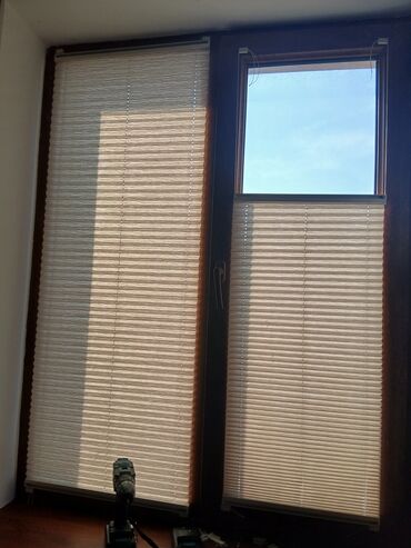 - Jalüz/plisse pərdələr: Pəncərə içi quraşdırma üçün, yuxarı-aşağı hərəkətli mexanizm. Günəş işığını yumşaldır, məxfiliyi təmin edir. Açıq bej/kremsi rəng nümunələri göstərilib.