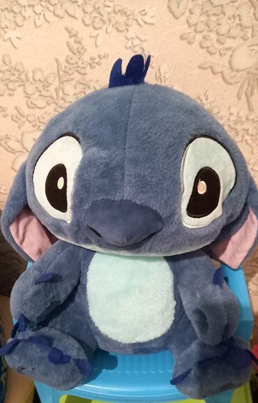- Mavi rəngli böyük Stitch temalı plyuş oyuncaq: yumşaq velür tipli parça, açıq mavi qarın hissəsi, iri ifadəli gözlər, qulaq içləri açıq çəhrayı. Oturaq formadadır, qucaqlamaq üçün ideal ölçüdə.
